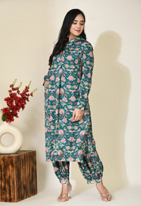 Amp up your fashion quotient with this beautiful forest multicolor gota patti viscose printed kurta with printed pant. This two-piece set includes a kurta with pants. The multicolor kurta has all over floral print with gota work. Shirt collar neckline with full sleeves, and cuff style. The Afghani printed pant has gota work on ''poucha'' with an elasticated waist belt.