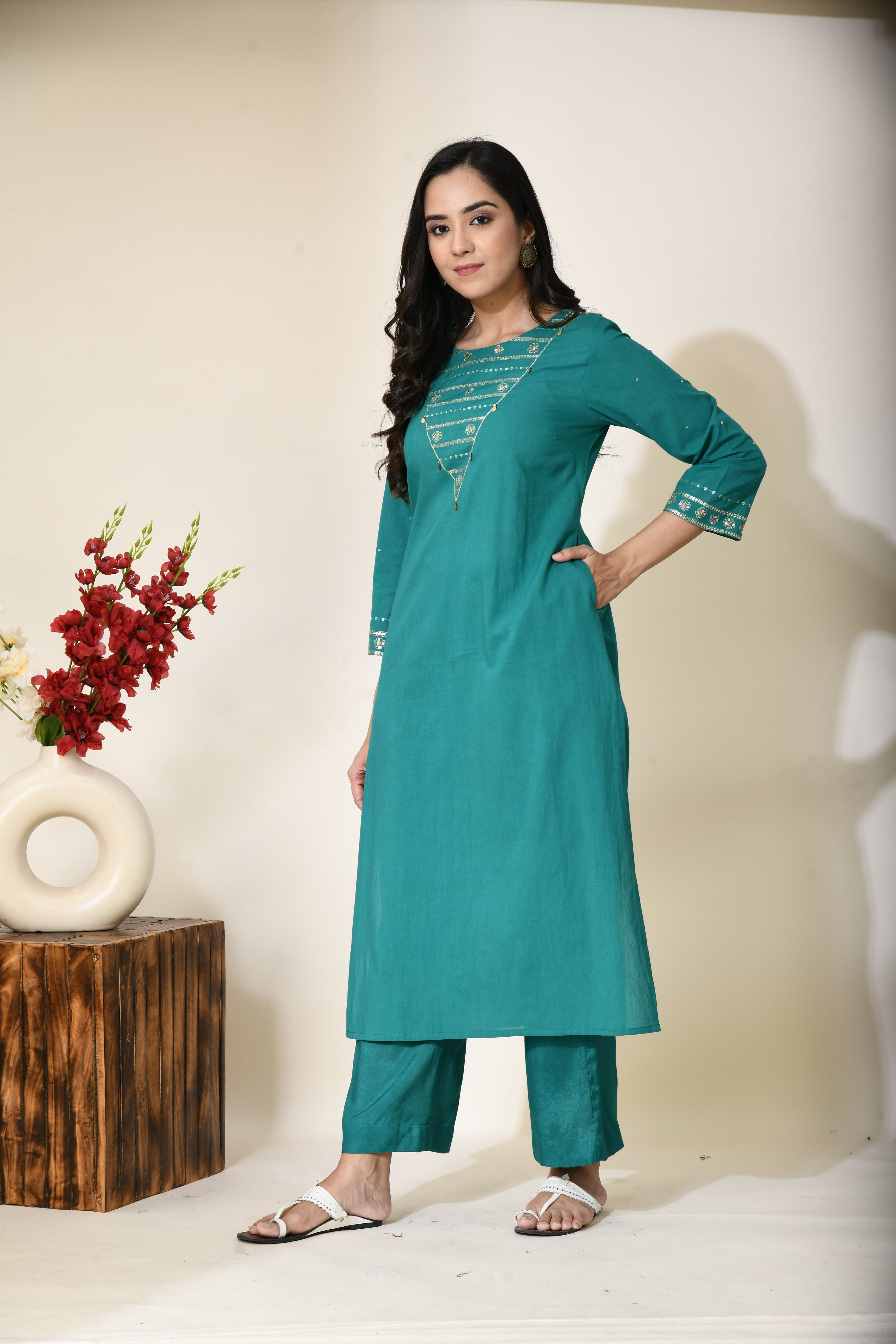Forest Green Aari Zari Work Pure Cotton Kurta | Green Cotton Kurta for Women