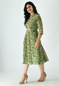 Green Pleated Flare Dress | Pleated Fit And Flare Dress for Women