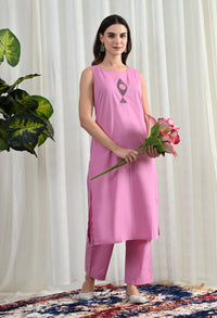Make a statement with the Rose Pink Kurta Set, a perfect blend of traditional craftsmanship and contemporary design. This set features a beautiful rose pink cotton kurta adorned with elegant Kantha hand embroidery showcasing a fish motif. Its sleeveless design adds a modern touch, making it an ideal piece for any occasion.