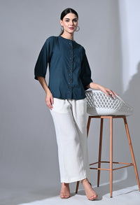 The top features intricate khanta handwork, highlighting skilled craftsmanship and a nod to traditional artistry. It is designed with a mandarin round neckline for a refined, polished look, while the half-length cuff sleeves offer a graceful yet relaxed fit. The front button opening adds an extra element of charm and ease.